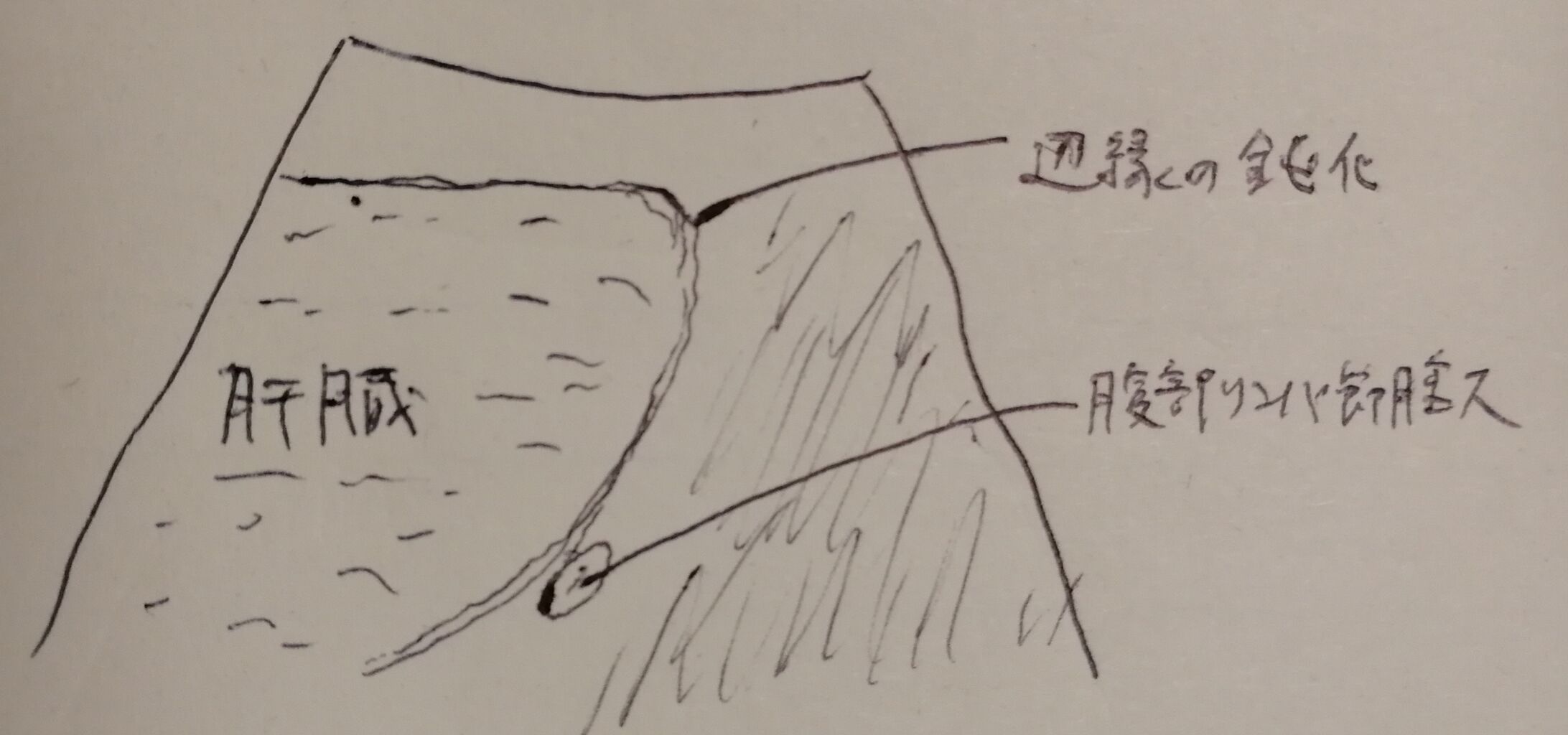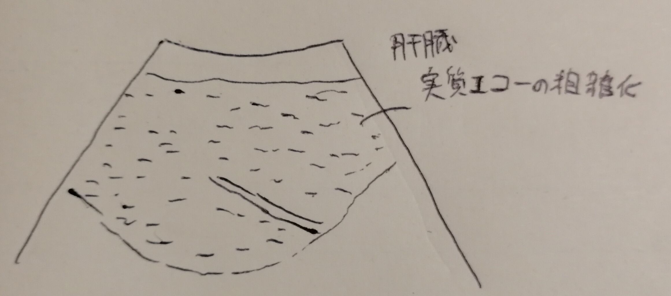 肝臓実質エコーの粗雑化を認め、辺縁は鈍化を認める。