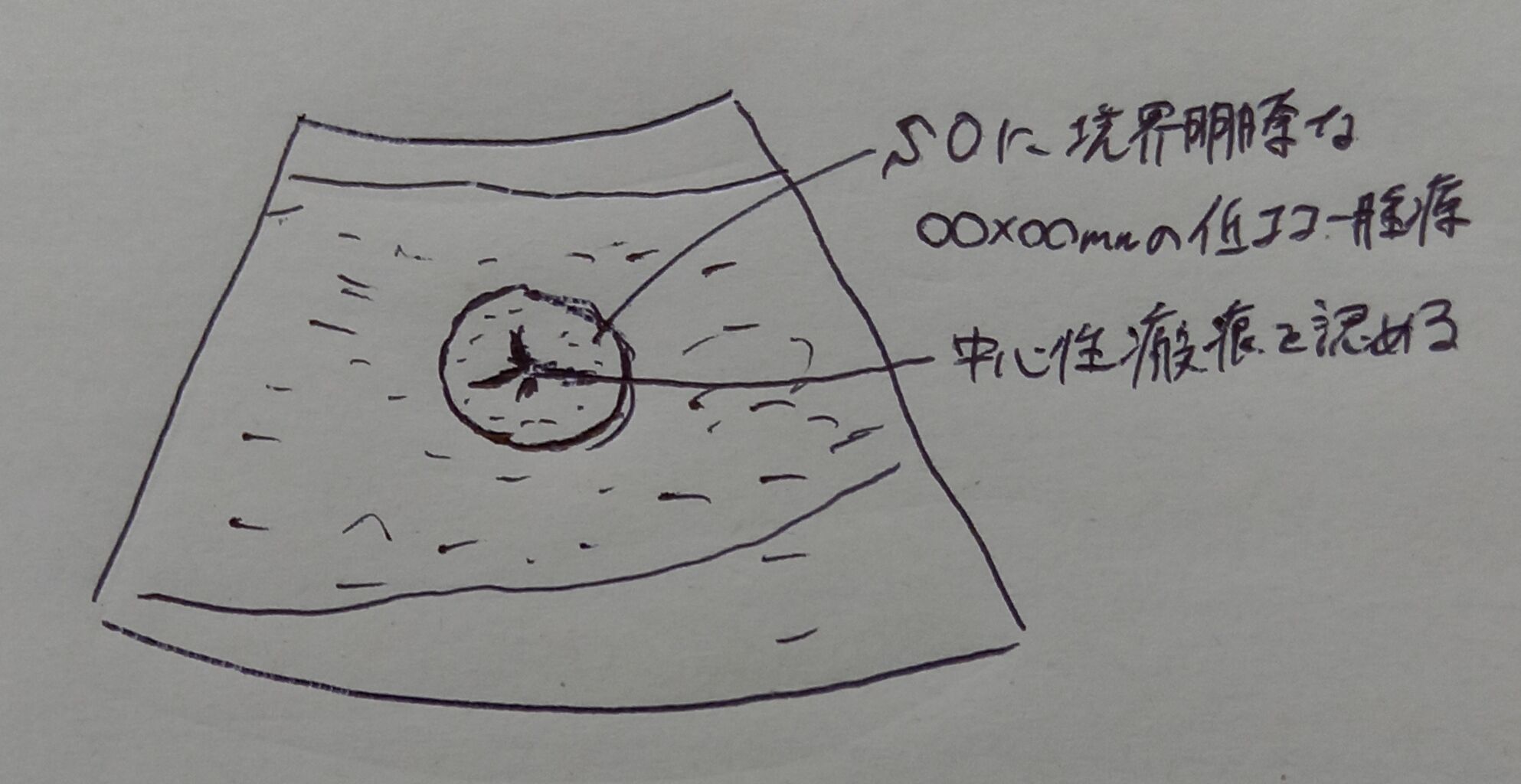 肝臓:S○○に○○mmの境界明瞭な低エコー腫瘤を認める。
