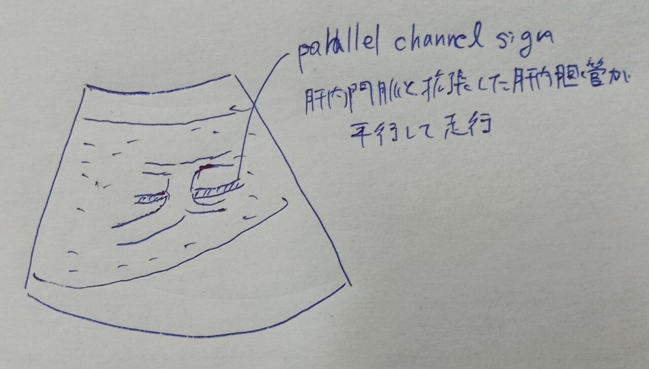 ・肝内胆管の拡張(parellelchannel sign)を認めるか?・肝外胆管の拡張(shotgun sign)を認めるか?
