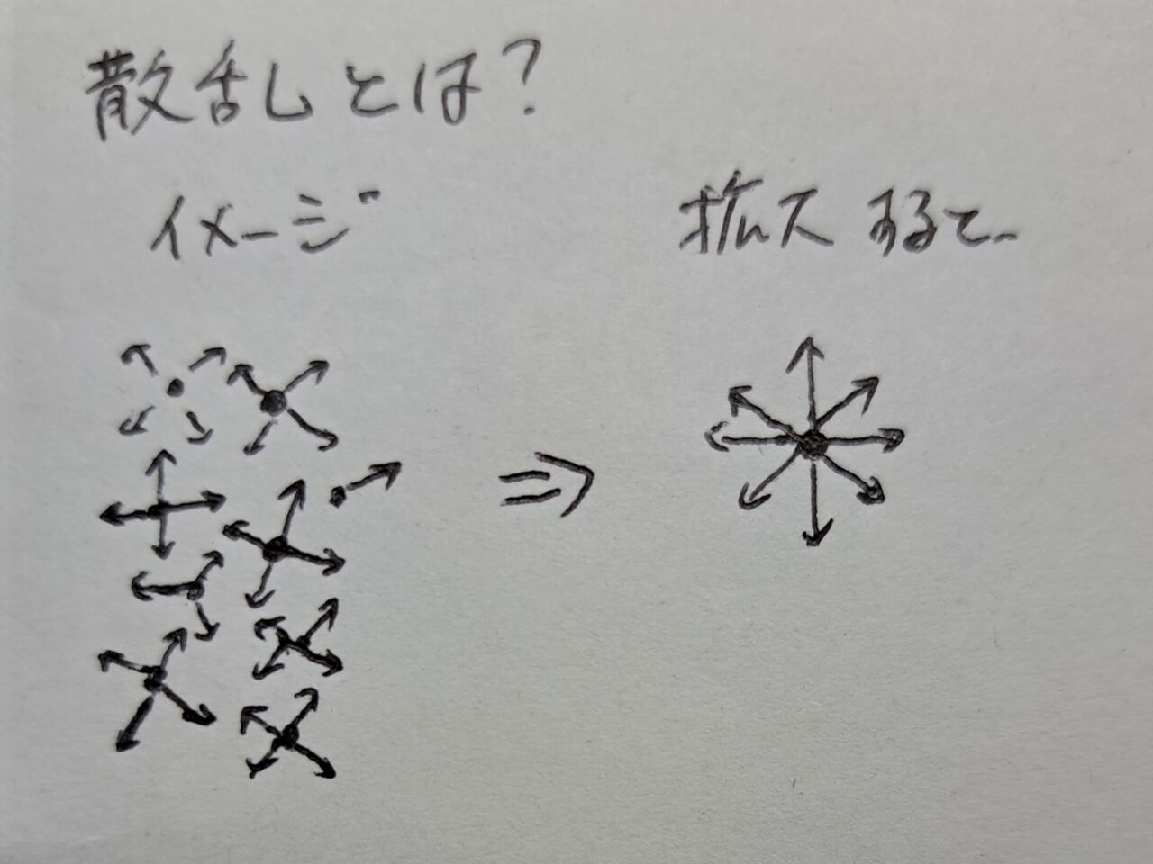 超音波が不規則な境界面あるいは微小反射体に当たると四方八方に広がる現象境界面の凸凹や反射体が波長より(小さ)い場合に起こる