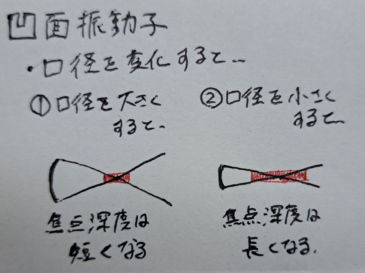口径を大きくすると→焦点深度が(③)くなる