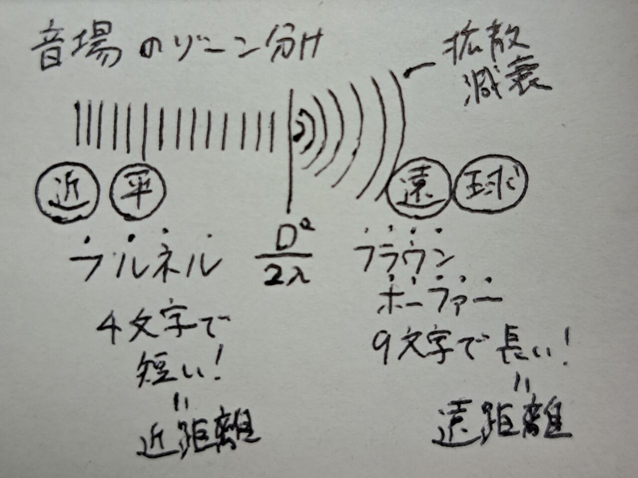 (2)遠距離(フラウンホーファーゾーン)→D2/4λより(遠)い領域→(球)面波(吸収減衰)