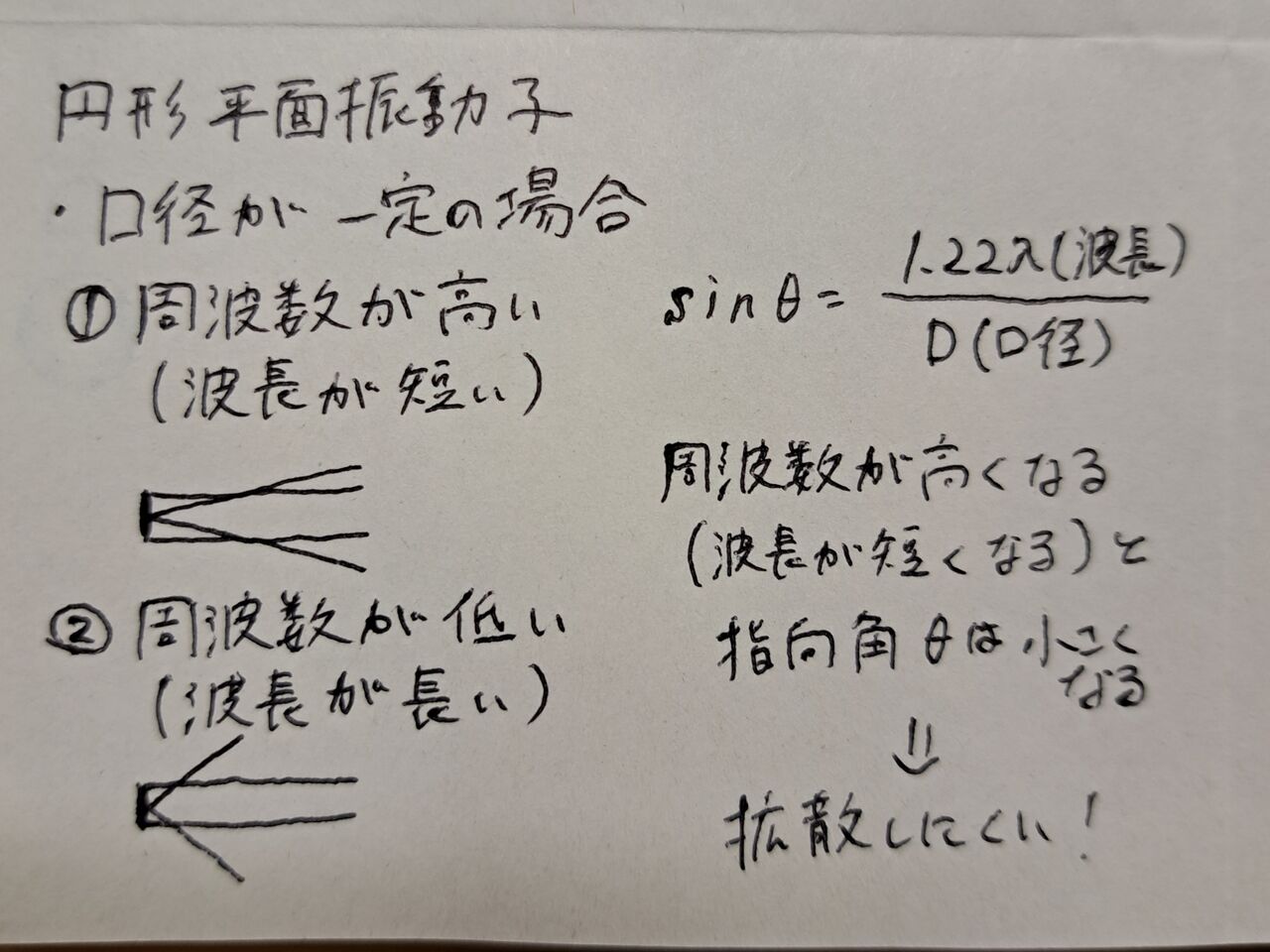 ⇒周波数が(高)いとビームは拡散しにくい。だだし近距離音場は長くなる